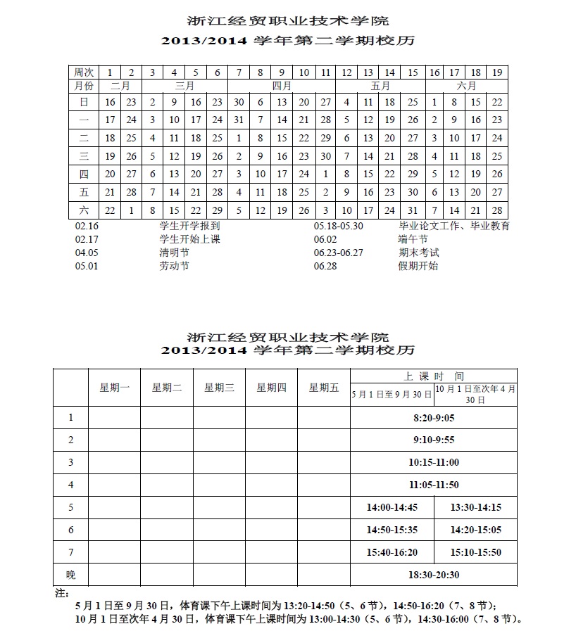 2013/2014学年第二学期校历